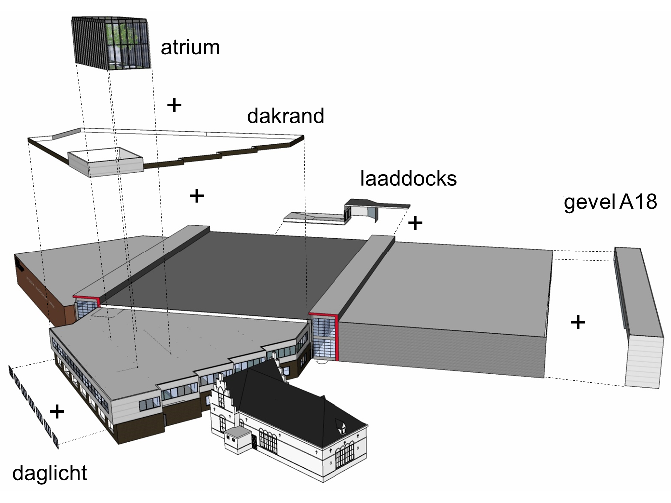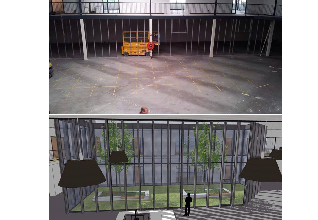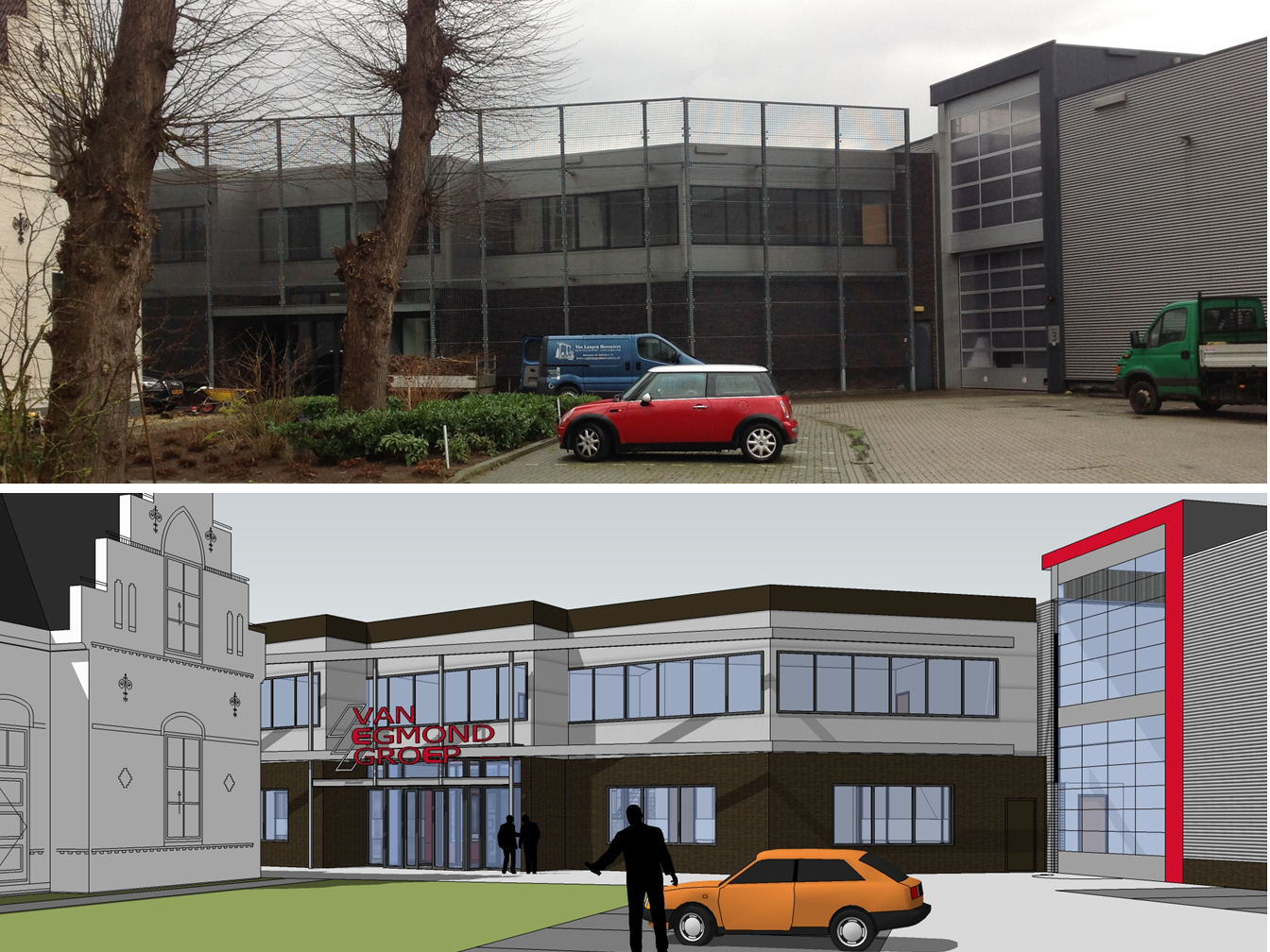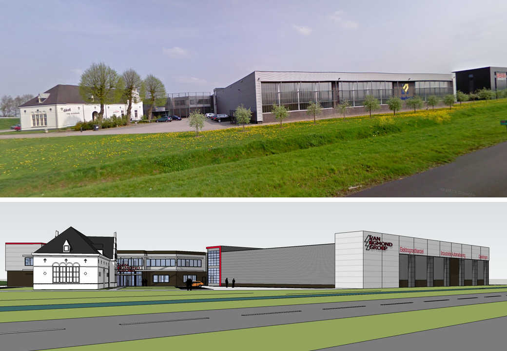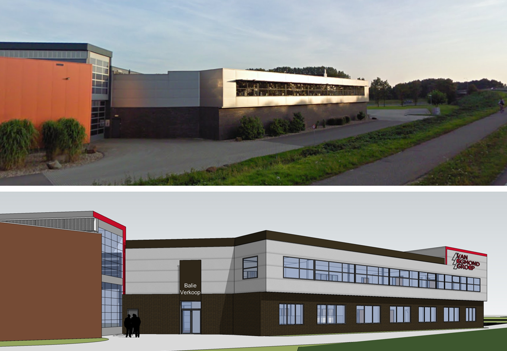 Het huidige pand van de van Egmond Groep werd te klein voor de groei van hun bedrijfsactiviteiten. Daarom verhuizen zij naar een groter bedrijfspand. Dit pand is echter niet geheel geschikt. Daarom hebben wij in overleg met de opdrachtgevers een aantal ingrepen voorgesteld. Functioneel wordt er een atrium in het kantorendeel toegevoegd voor een prettige werkomgeving met meer licht in het gebouw. In de gebouwplint worden daglichtopeningen uitgespaard, er wordt een dubbele dockshelter toegevoegd, de 5500m² asfaltvloer wordt voorzien van vloerverwarming en het hele gebouw van LED verlichting. Esthetisch zijn na diverse studies, waaronder het plaatsen van een glazen voorzetgevel de volgende ingrepen voorgesteld: Er wordt een nieuwe, representatieve gevel langs de A18 opgetrokken, op het kantorenblok wordt een sierband met een kopverhoging geplaatst waarop de reclame een plek krijgt, de bestaande roostergevel wordt gesloopt om een vriendelijker uiterlijk te tonen en de kleurstelling wordt aangepast op de huisstijl van de van Egmond Groep. Een mooi voorbeeld van een gebouw geschikt te maken voor een nieuwe gebruiker door middel van gerichte ingrepen, op maat gemaakt.