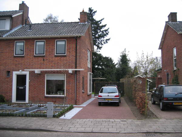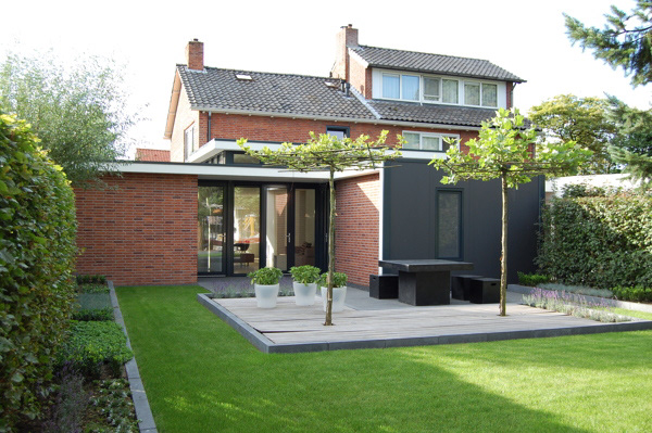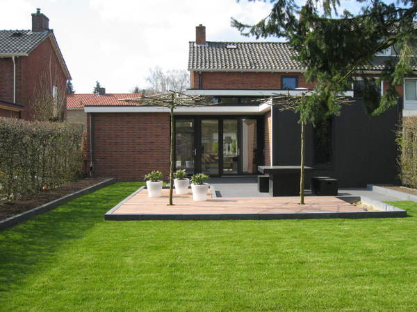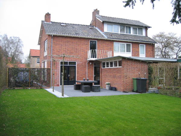 Deze tweekapper uit 1957 heeft een moderne, maar toch bijpassende aanbouw gekregen. Door de uitbreiding een vrije ruimte te geven van 3,3m hoog, ontstaat er een enorme ruimtelijkheid, die nog eens versterkt wordt door het licht uit de bovenramen en een dakkoepel in de net zo hoge badkamer. De tuin is een modern en onderhoudsvriendelijk. Door met vlakken in verschillende materialen te werken, versterkt het de zichtlijn naar achter op een speelse manier en geeft het diepte aan de tuin.